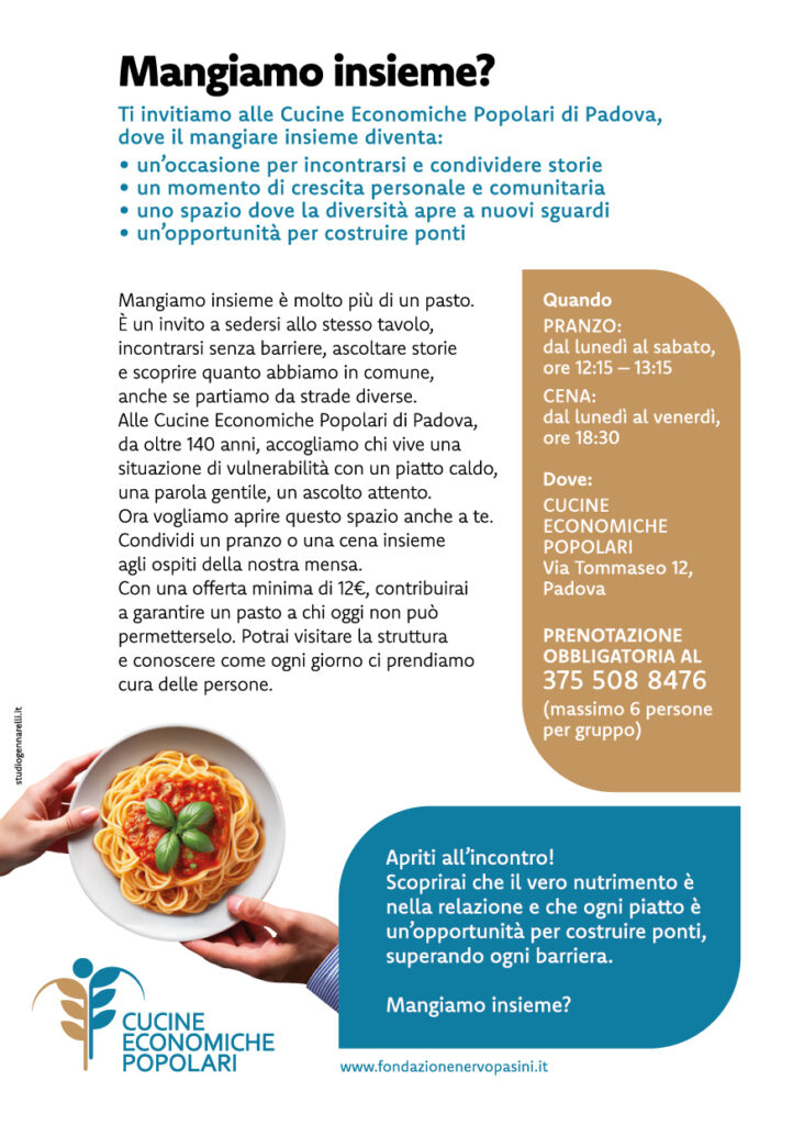 Ogni giorno, alle Cucine Economiche Popolari, centinaia di persone si siedono a tavola per ricevere un pasto caldo, un saluto, uno sguardo. Ma accanto a quel gesto quotidiano, semplice e necessario, c’è spazio per un’altra proposta: sedersi a tavola con loro. È da questo desiderio che nasce l’iniziativa “Mangiamo insieme?”, un invito rivolto a chiunque voglia vivere un’esperienza di ascolto, prossimità e incontro attraverso la condivisione del pasto.
